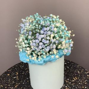 Голубая гипсофила с хлопком и Raffaello в шляпной коробке